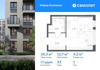 Строим кварталы для жизни с заботой о будущем. Предлагается квартира студия комфорт-класса 26,25 кв.м в корпусе 33 на 1 этаже, в ЖК "Новое Колпино"