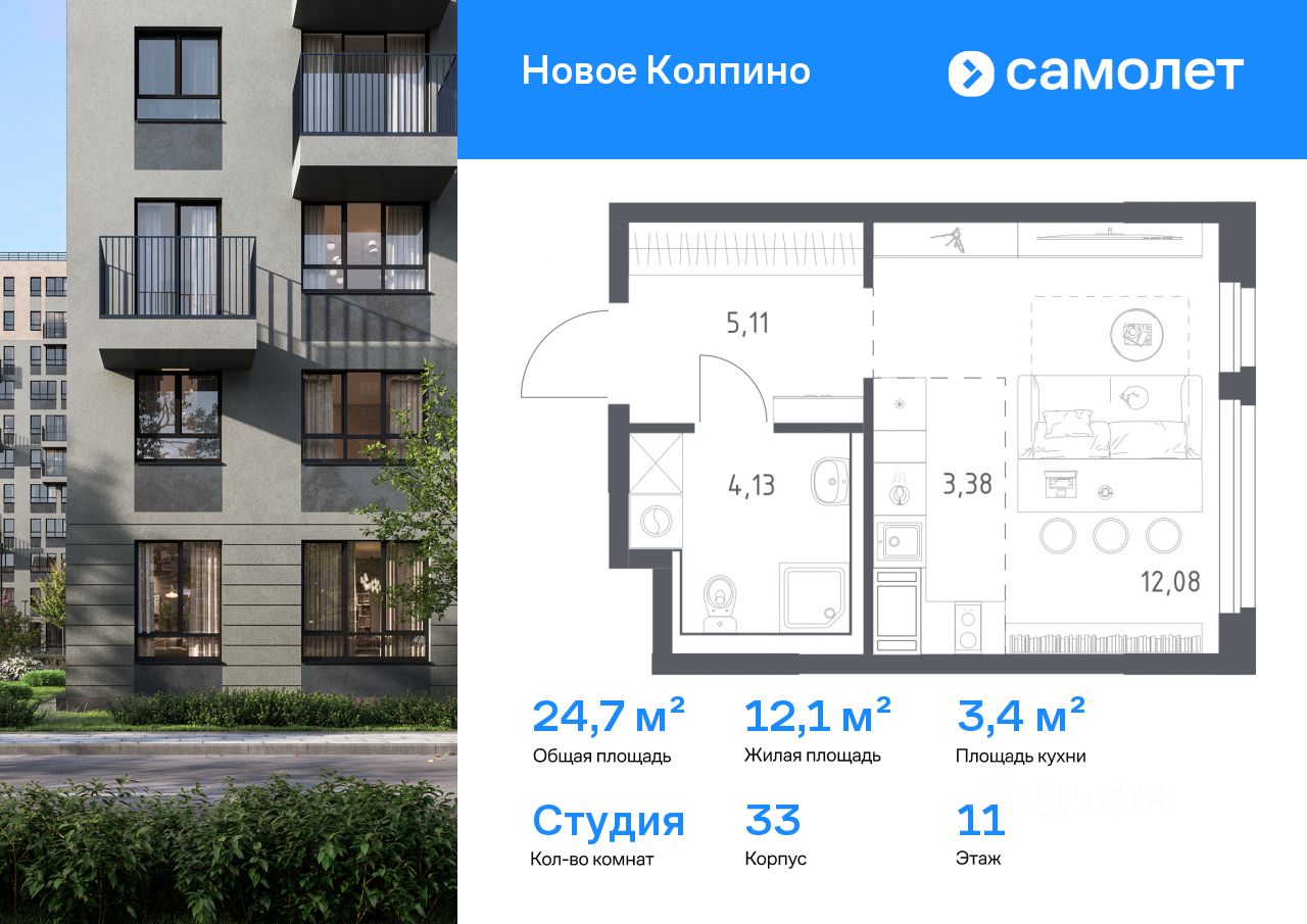 Строим кварталы для жизни с заботой о будущем. Предлагается квартира студия комфорт-класса 24,7 кв.м в корпусе 33 на 11 этаже, в ЖК "Новое Колпино"