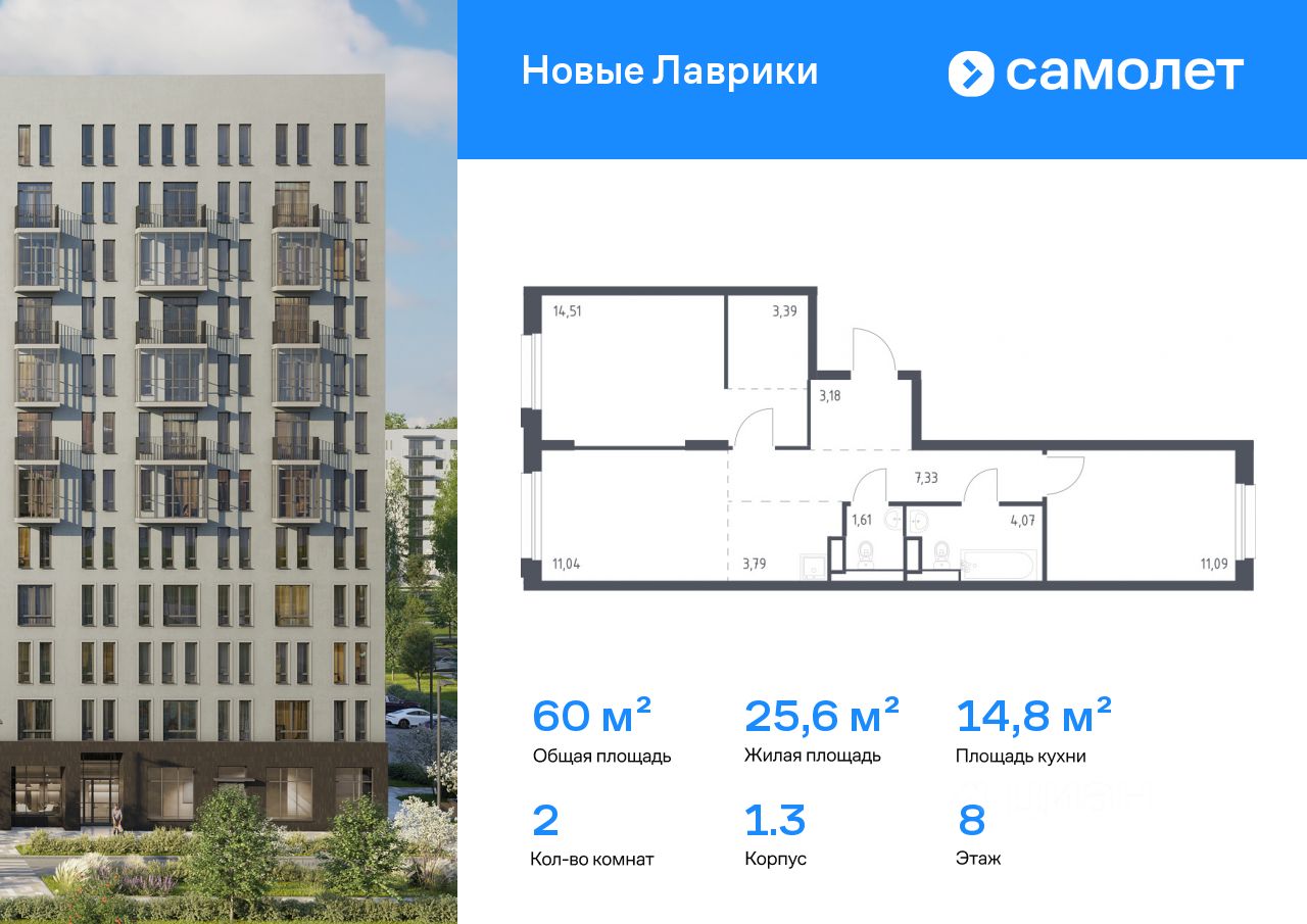 Строим кварталы для жизни с заботой о будущем. Предлагается 2-комнатная квартира комфорт-класса 60,01 кв.м в корпусе 1.3 на 8 этаже, в ЖК "Новые Лаврики"
