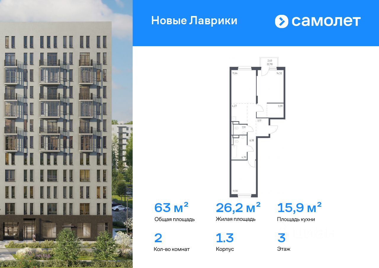 Строим кварталы для жизни с заботой о будущем. Предлагается 2-комнатная квартира комфорт-класса 62,96 кв.м в корпусе 1.3 на 3 этаже, в ЖК "Новые Лаврики"