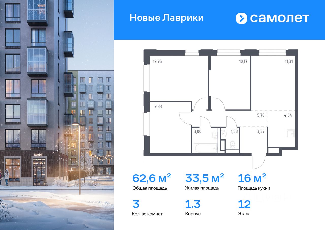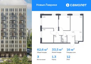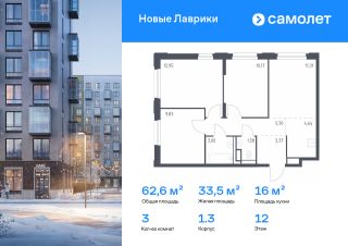Строим кварталы для жизни с заботой о будущем. Предлагается 3-комнатная квартира комфорт-класса 62,55 кв.м в корпусе 1.3 на 12 этаже, в ЖК "Новые Лаврики"
