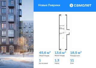 Строим кварталы для жизни с заботой о будущем. Предлагается 1-комнатная квартира комфорт-класса 45,58 кв.м в корпусе 1.3 на 11 этаже, в ЖК "Новые Лаврики"