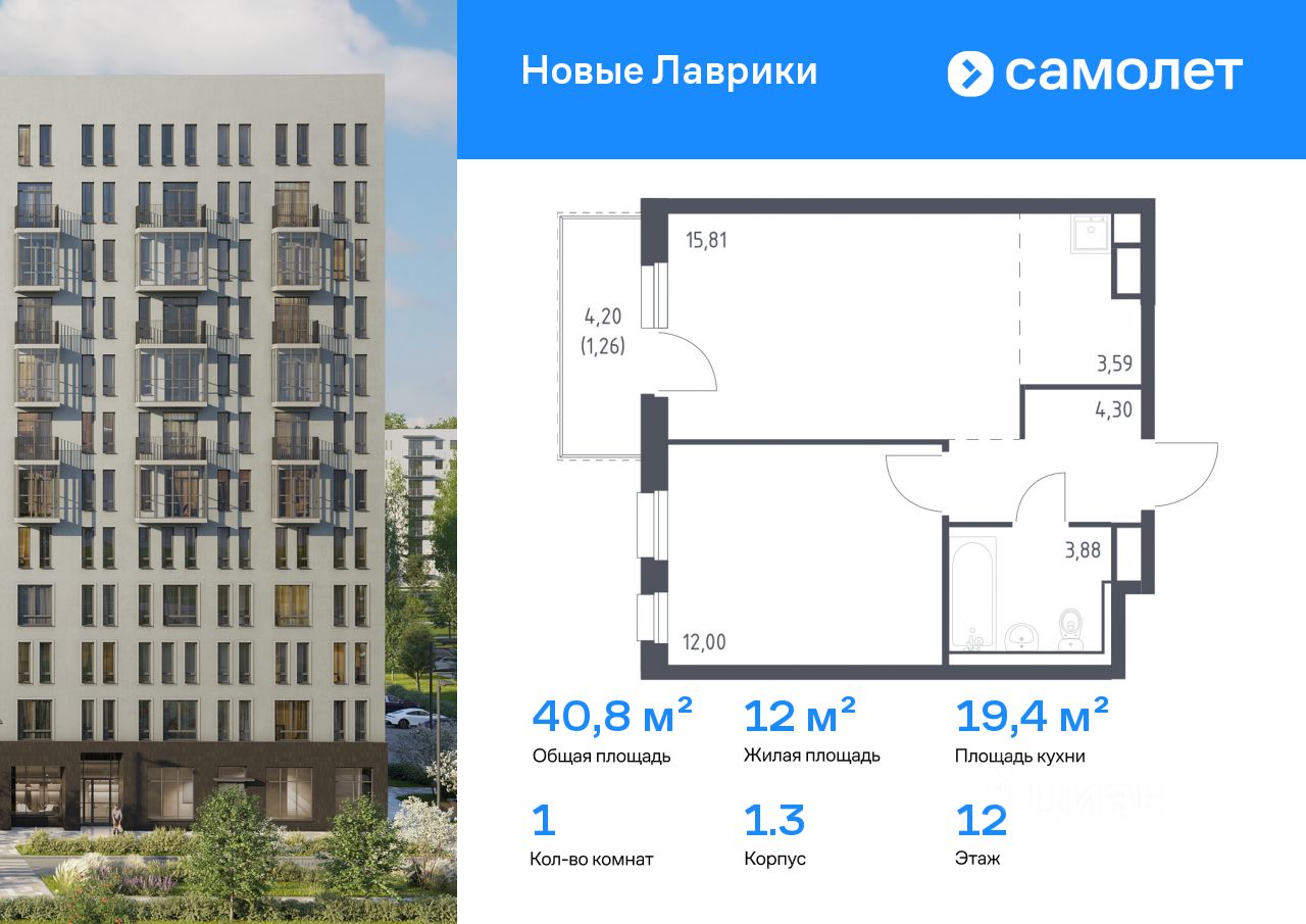 Строим кварталы для жизни с заботой о будущем. Предлагается 1-комнатная квартира комфорт-класса 40,84 кв.м в корпусе 1.3 на 12 этаже, в ЖК "Новые Лаврики"