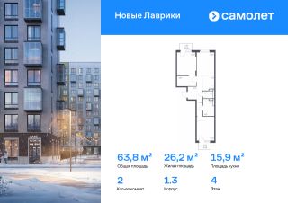 Строим кварталы для жизни с заботой о будущем. Предлагается 2-комнатная квартира комфорт-класса 63,75 кв.м в корпусе 1.3 на 4 этаже, в ЖК "Новые Лаврики"