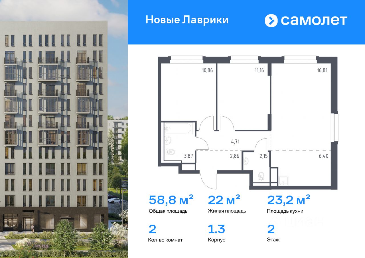Строим кварталы для жизни с заботой о будущем. Предлагается 2-комнатная квартира комфорт-класса 58,82 кв.м в корпусе 1.3 на 2 этаже, в ЖК "Новые Лаврики"
