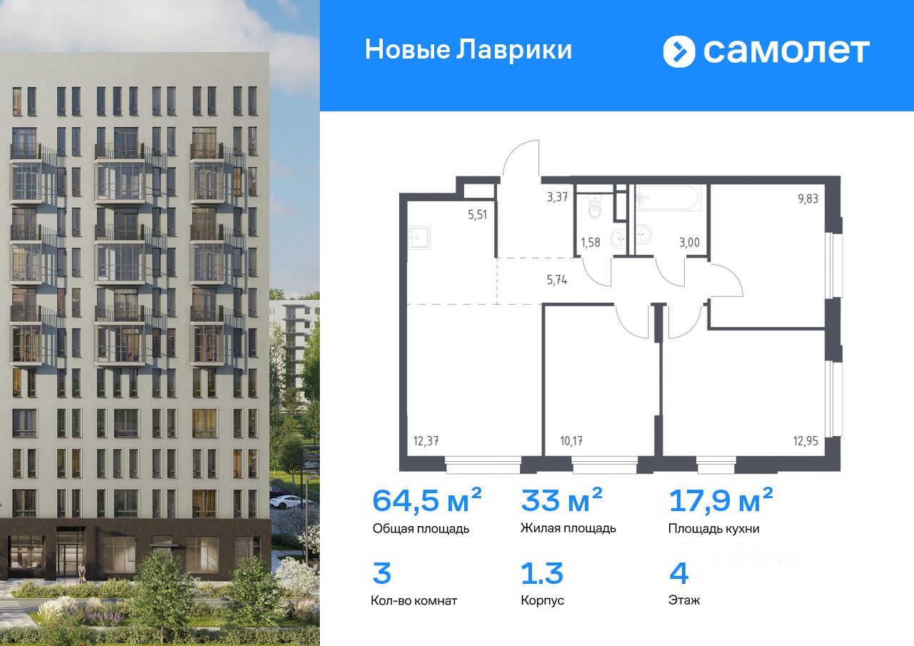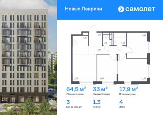 Строим кварталы для жизни с заботой о будущем. Предлагается 3-комнатная квартира комфорт-класса 64,52 кв.м в корпусе 1.3 на 4 этаже, в ЖК "Новые Лаврики"
