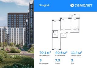 Строим кварталы для жизни с заботой о будущем. Предлагается 3-комнатная квартира комфорт-класса 70,12 кв.м в корпусе 7.3 на 3 этаже, в ЖК "Сандэй"
