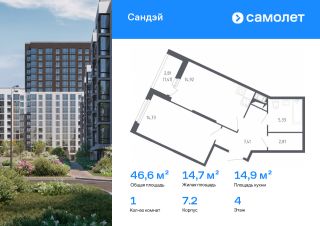 Строим кварталы для жизни с заботой о будущем. Предлагается 1-комнатная квартира комфорт-класса 46,61 кв.м в корпусе 7.2 на 4 этаже, в ЖК "Сандэй"