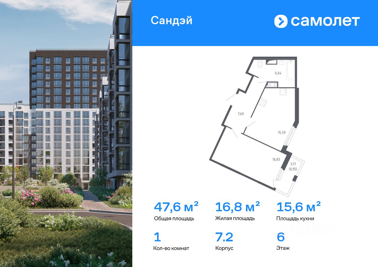 Строим кварталы для жизни с заботой о будущем. Предлагается 1-комнатная квартира комфорт-класса 47,61 кв.м в корпусе 7.2 на 6 этаже, в ЖК "Сандэй"