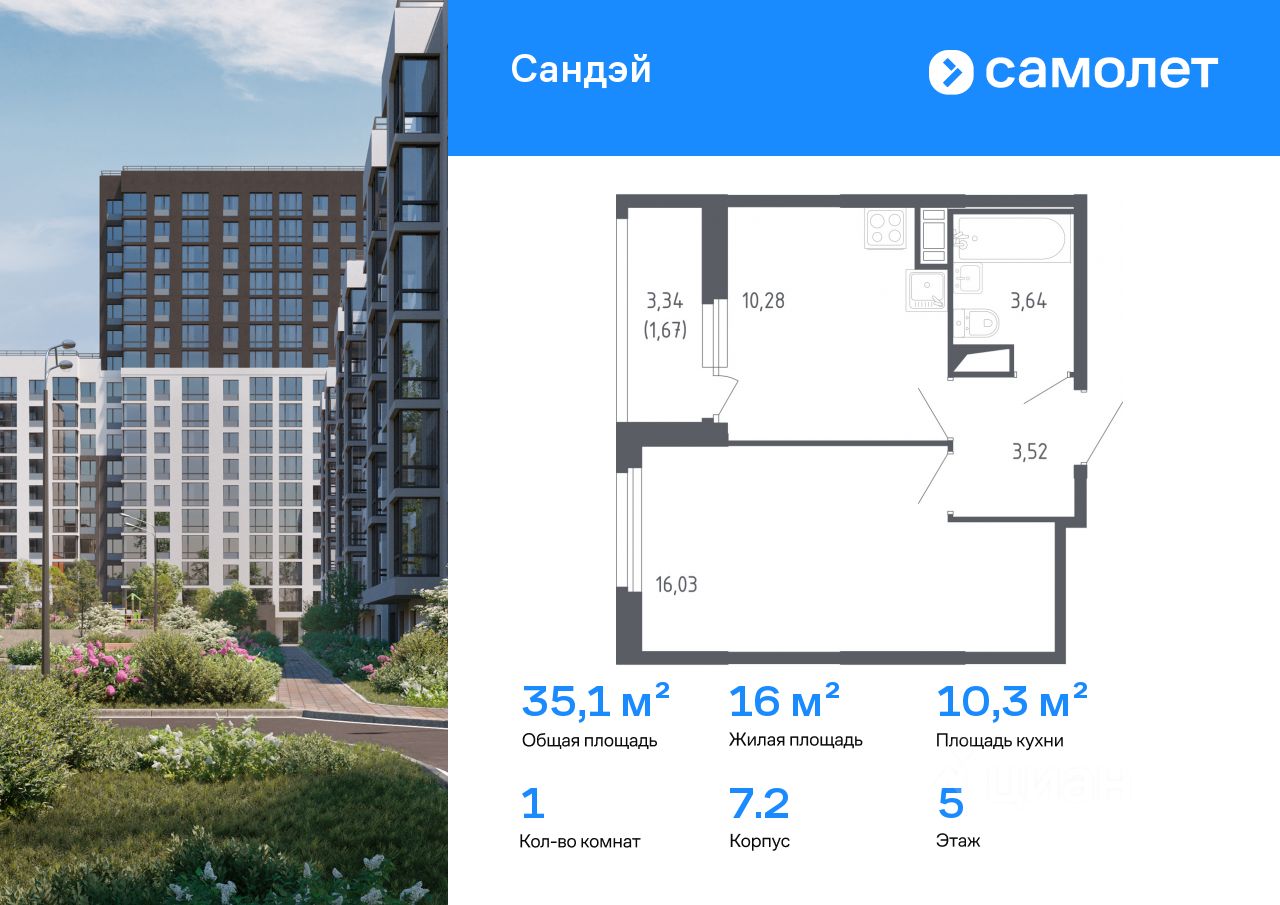 Строим кварталы для жизни с заботой о будущем. Предлагается 1-комнатная квартира комфорт-класса 35,14 кв.м в корпусе 7.2 на 5 этаже, в ЖК "Сандэй"