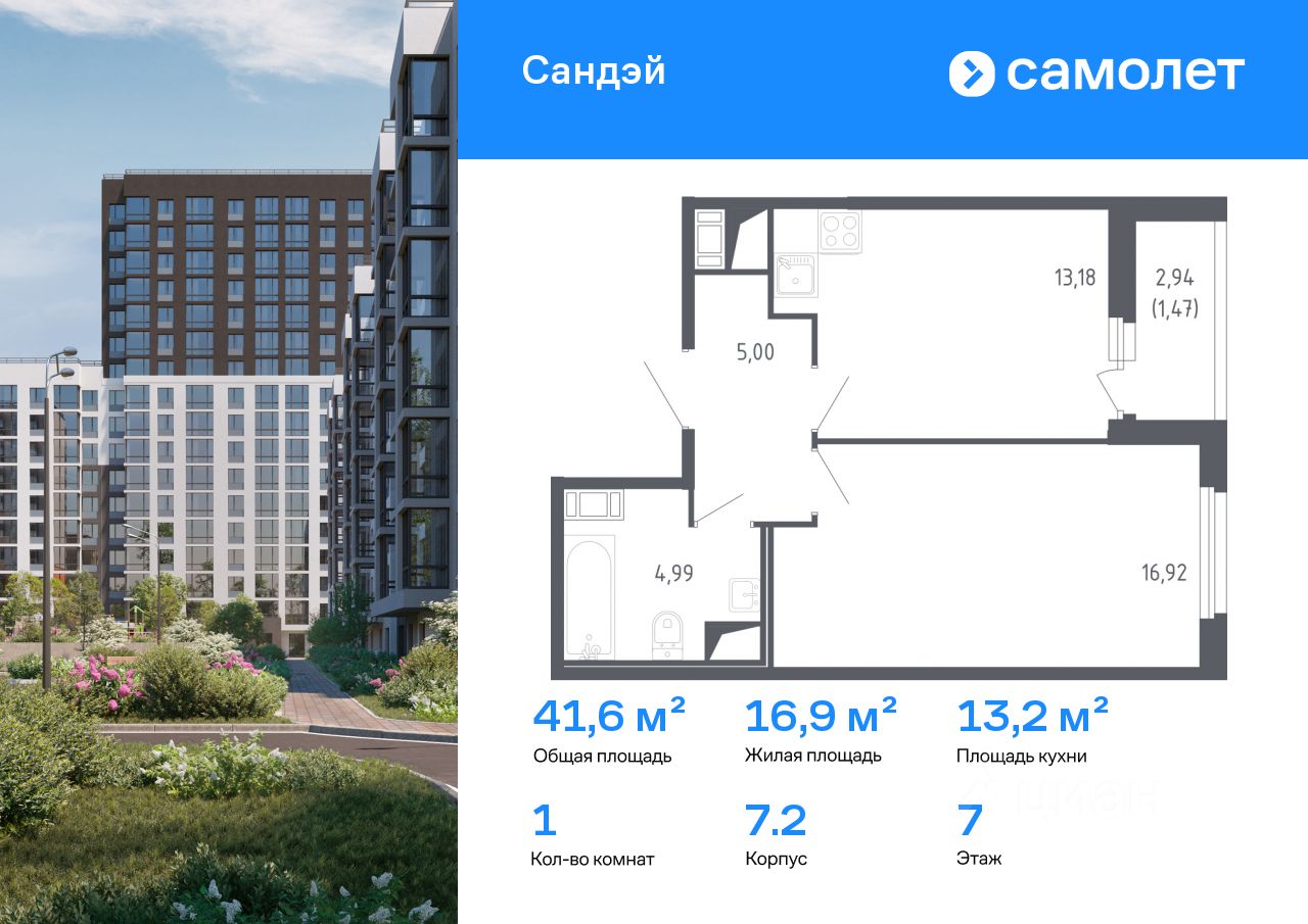 Строим кварталы для жизни с заботой о будущем. Предлагается 1-комнатная квартира комфорт-класса 41,56 кв.м в корпусе 7.2 на 7 этаже, в ЖК "Сандэй"