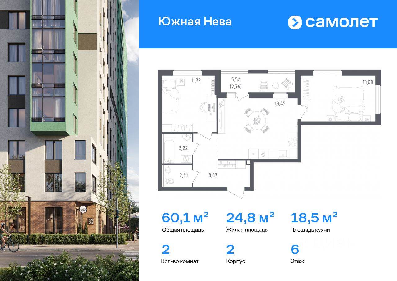Строим кварталы для жизни с заботой о будущем. Предлагается 2-комнатная квартира комфорт-класса 60,11 кв.м в корпусе 2 на 6 этаже, в ЖК "Южная Нева"