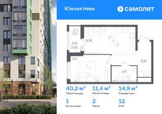 Строим кварталы для жизни с заботой о будущем. Предлагается 1-комнатная квартира комфорт-класса 40,22 кв.м в корпусе 2 на 12 этаже, в ЖК "Южная Нева"