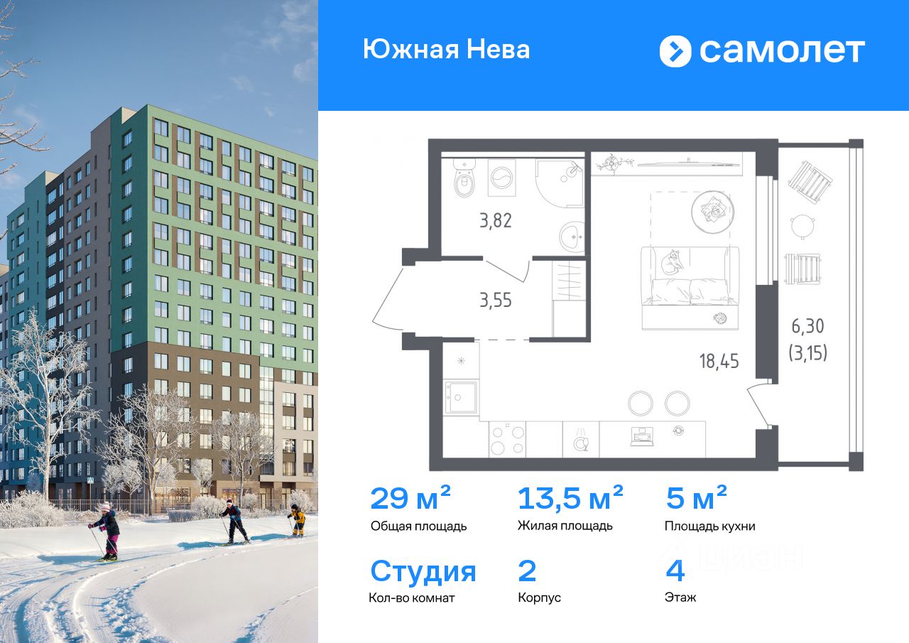 Строим кварталы для жизни с заботой о будущем. Предлагается квартира студия комфорт-класса 28,97 кв.м в корпусе 2 на 4 этаже, в ЖК "Южная Нева"
