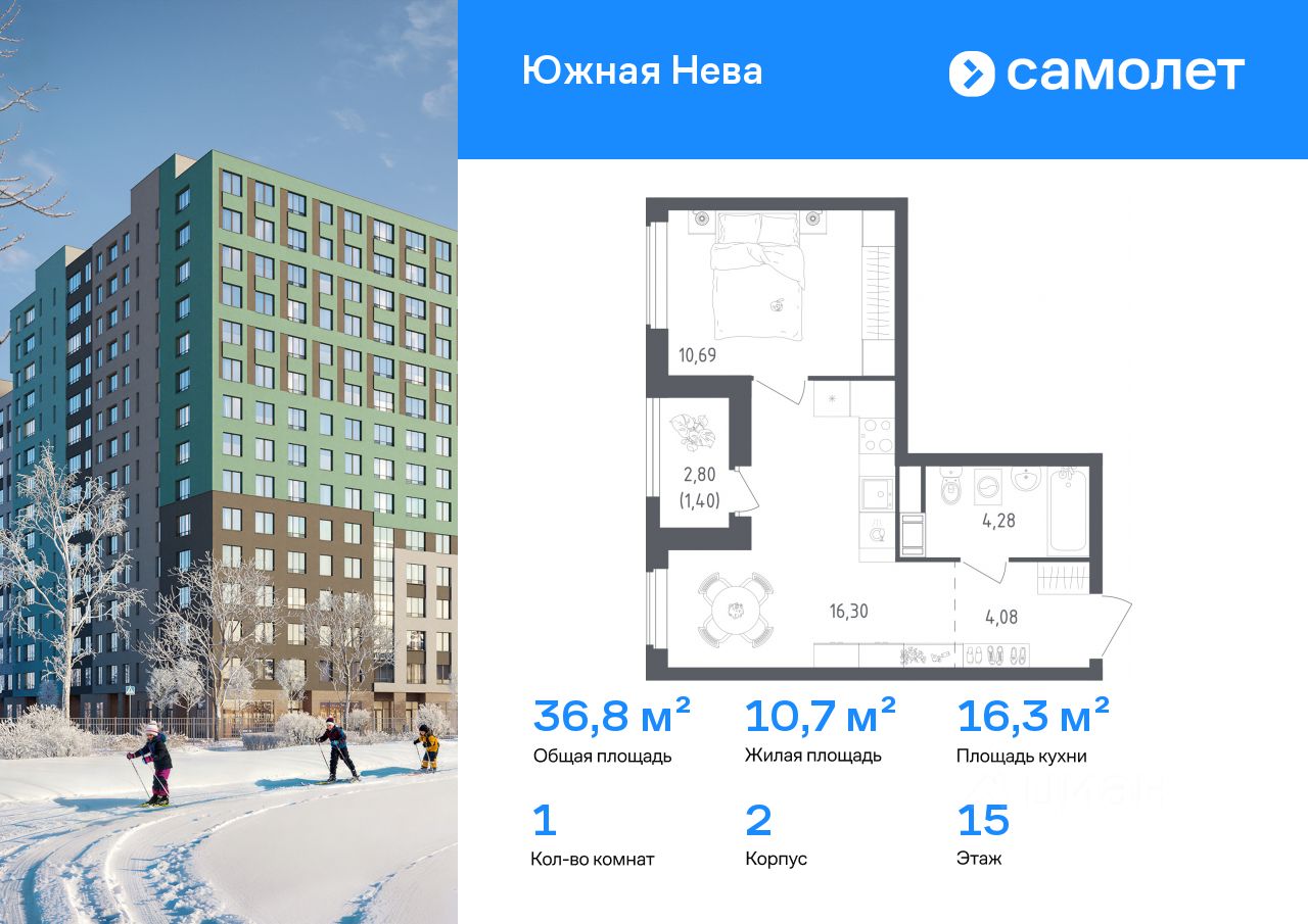 Строим кварталы для жизни с заботой о будущем. Предлагается 1-комнатная квартира комфорт-класса 36,75 кв.м в корпусе 2 на 15 этаже, в ЖК "Южная Нева"