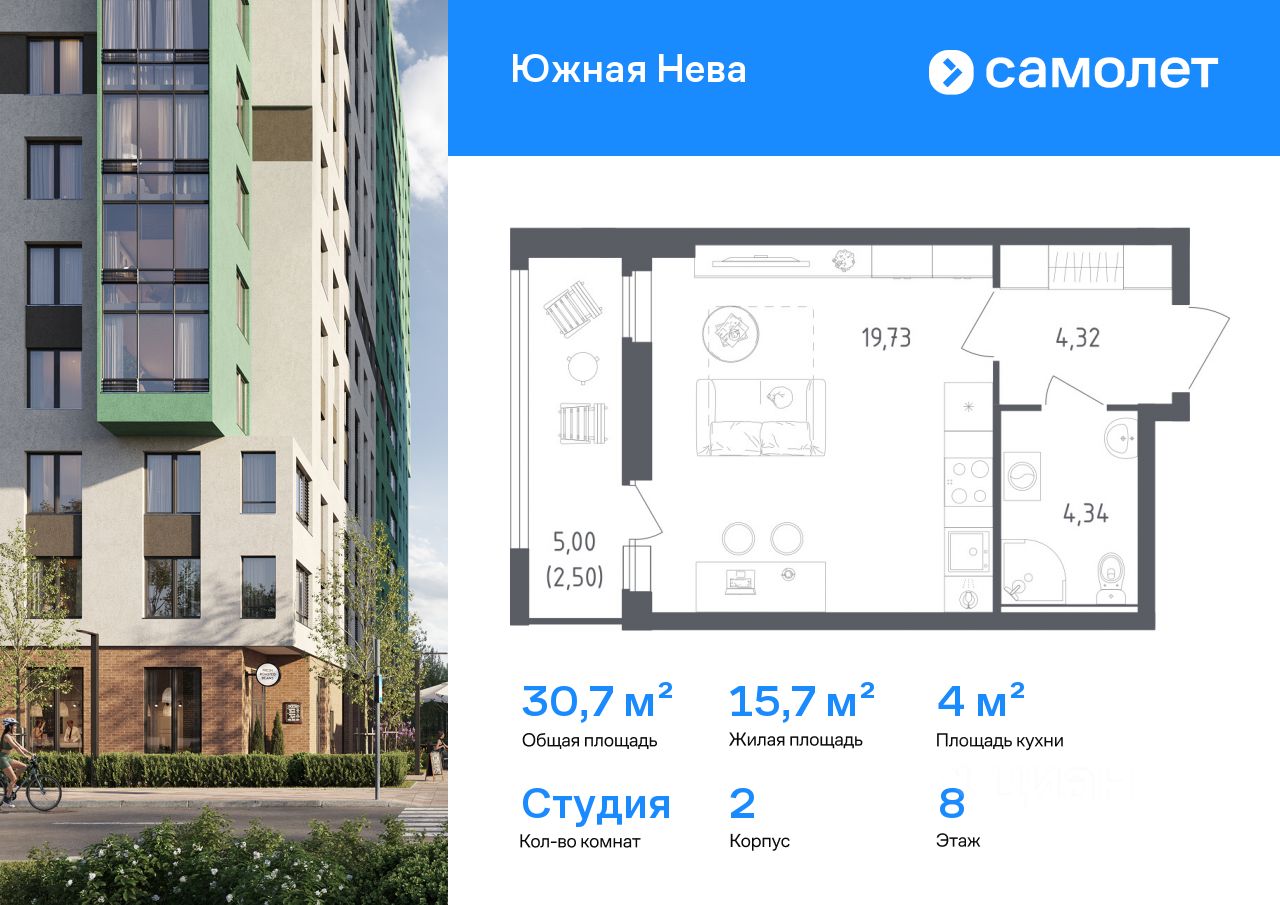 Строим кварталы для жизни с заботой о будущем. Предлагается квартира студия комфорт-класса 30,69 кв.м в корпусе 2 на 8 этаже, в ЖК "Южная Нева"