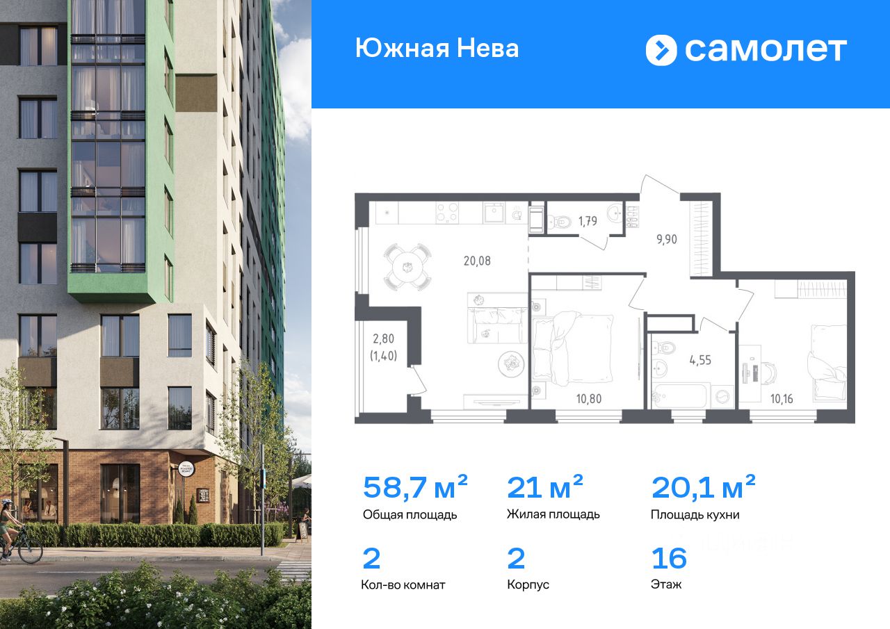 Строим кварталы для жизни с заботой о будущем. Предлагается 2-комнатная квартира комфорт-класса 58,68 кв.м в корпусе 2 на 16 этаже, в ЖК "Южная Нева"