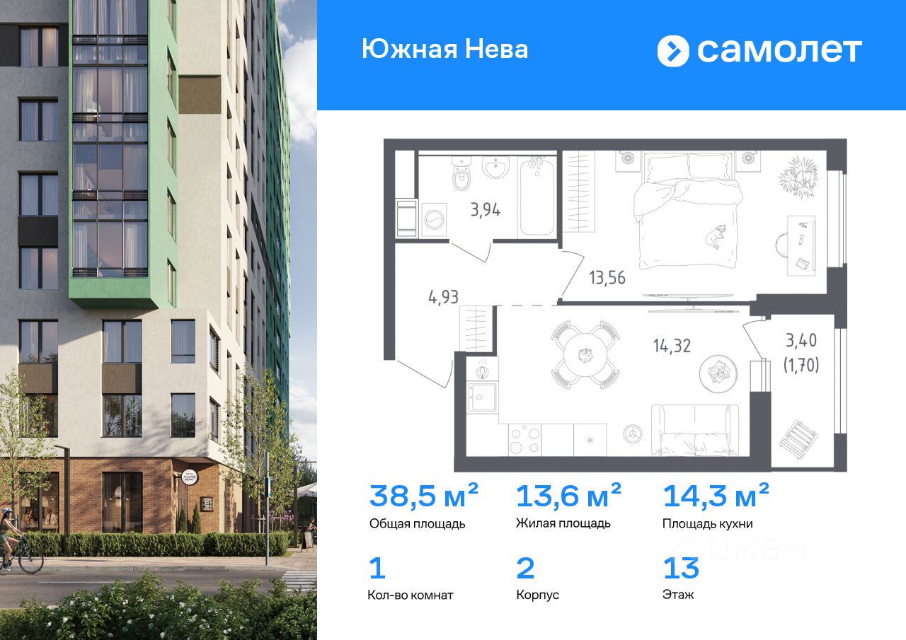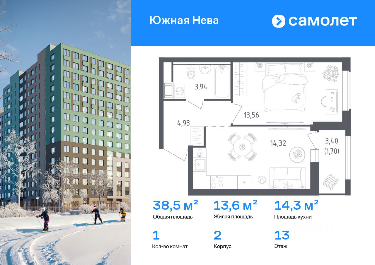 Строим кварталы для жизни с заботой о будущем. Предлагается 1-комнатная квартира комфорт-класса 38,45 кв.м в корпусе 2 на 13 этаже, в ЖК "Южная Нева"