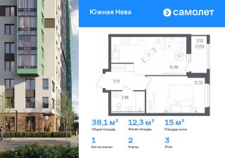 Строим кварталы для жизни с заботой о будущем. Предлагается 1-комнатная квартира комфорт-класса 38,14 кв.м в корпусе 2 на 3 этаже, в ЖК "Южная Нева"