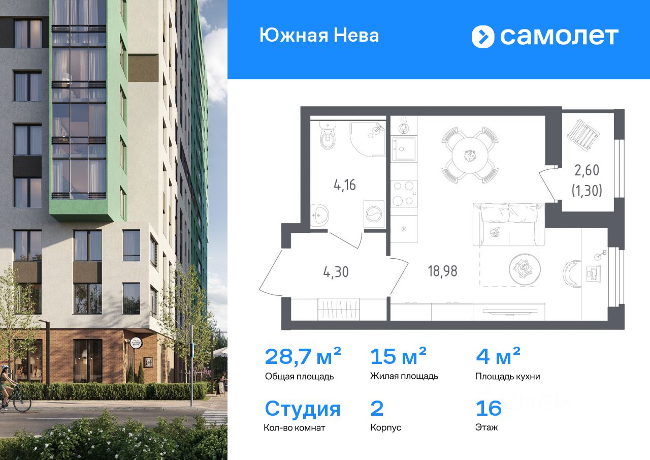Строим кварталы для жизни с заботой о будущем. Предлагается квартира студия комфорт-класса 28,74 кв.м в корпусе 2 на 16 этаже, в ЖК "Южная Нева"