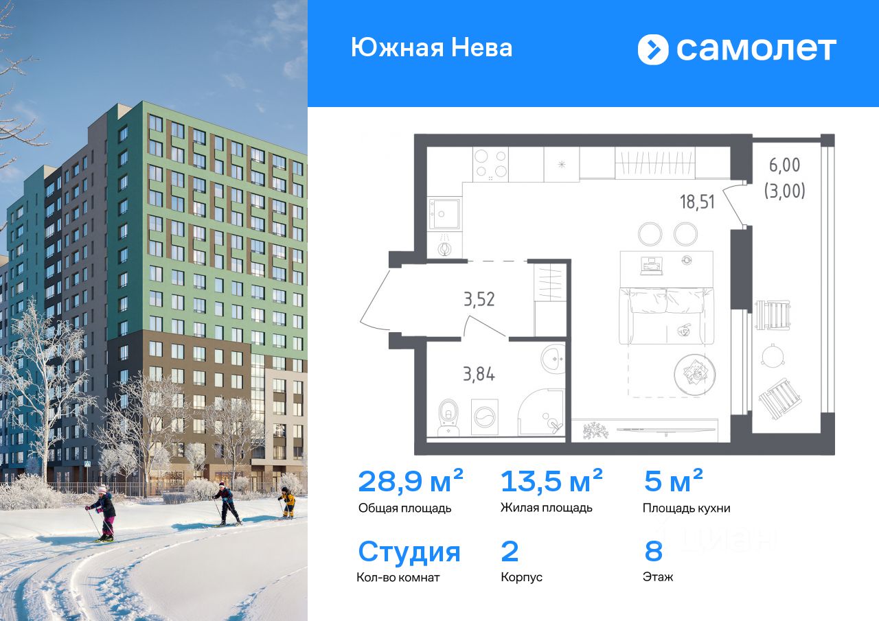 Строим кварталы для жизни с заботой о будущем. Предлагается квартира студия комфорт-класса 28,87 кв.м в корпусе 2 на 8 этаже, в ЖК "Южная Нева"