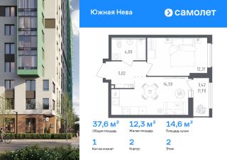 Строим кварталы для жизни с заботой о будущем. Предлагается 1-комнатная квартира комфорт-класса 37,63 кв.м в корпусе 2 на 2 этаже, в ЖК "Южная Нева"