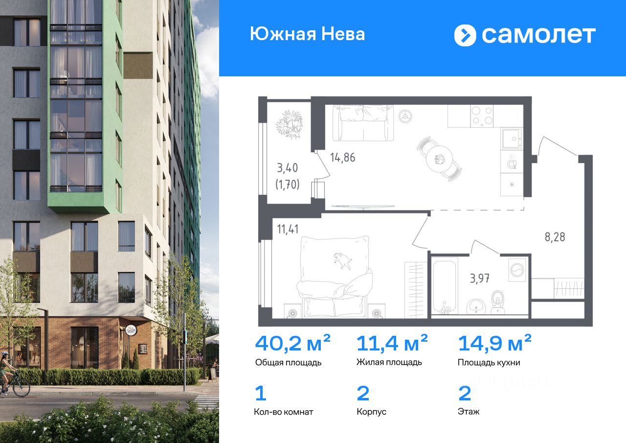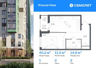 Строим кварталы для жизни с заботой о будущем. Предлагается 1-комнатная квартира комфорт-класса 40,22 кв.м в корпусе 2 на 2 этаже, в ЖК "Южная Нева"