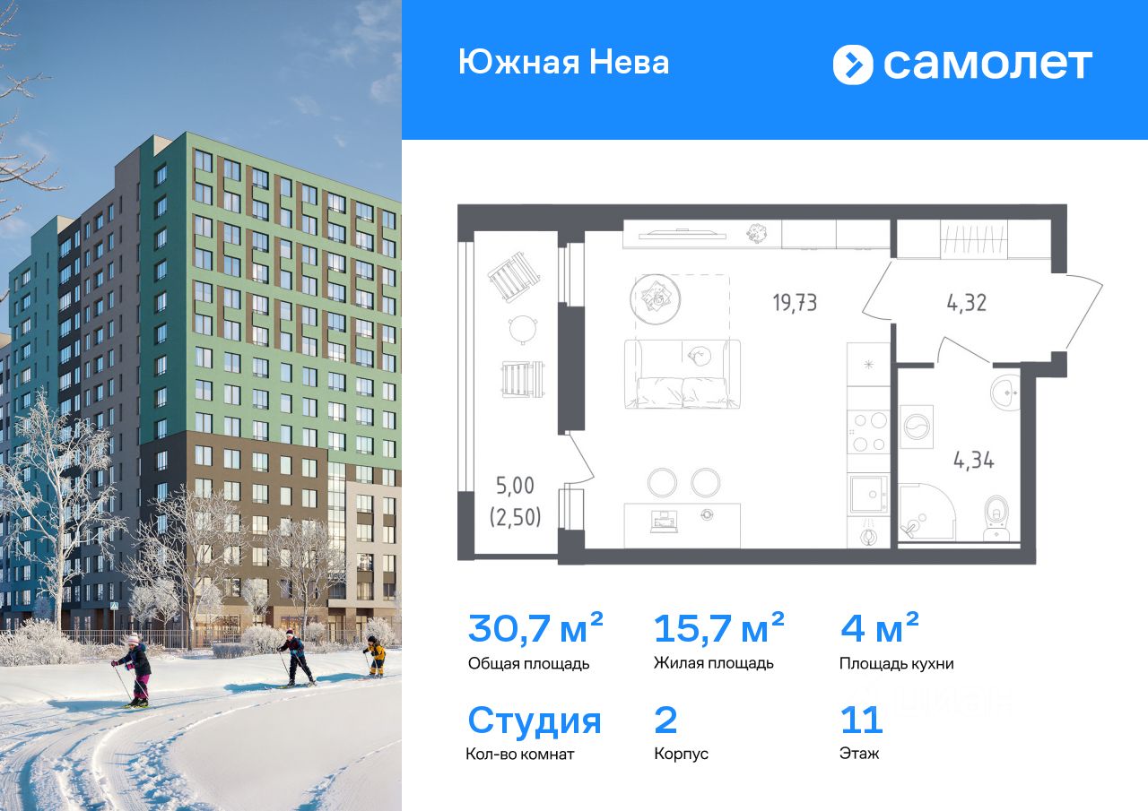 Строим кварталы для жизни с заботой о будущем. Предлагается квартира студия комфорт-класса 30,69 кв.м в корпусе 2 на 11 этаже, в ЖК "Южная Нева"