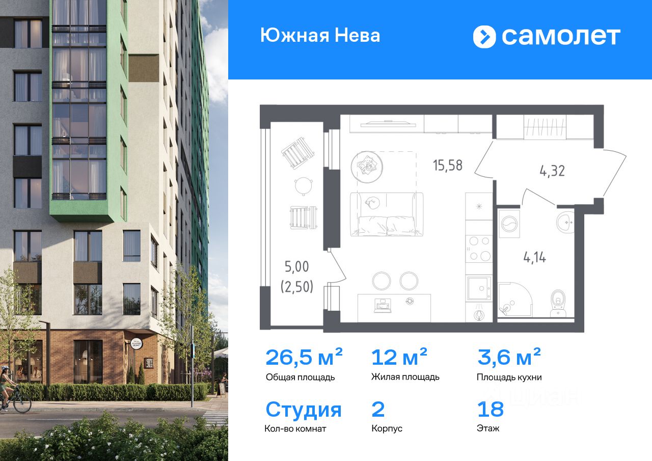 Строим кварталы для жизни с заботой о будущем. Предлагается квартира студия комфорт-класса 26,54 кв.м в корпусе 2 на 18 этаже, в ЖК "Южная Нева"