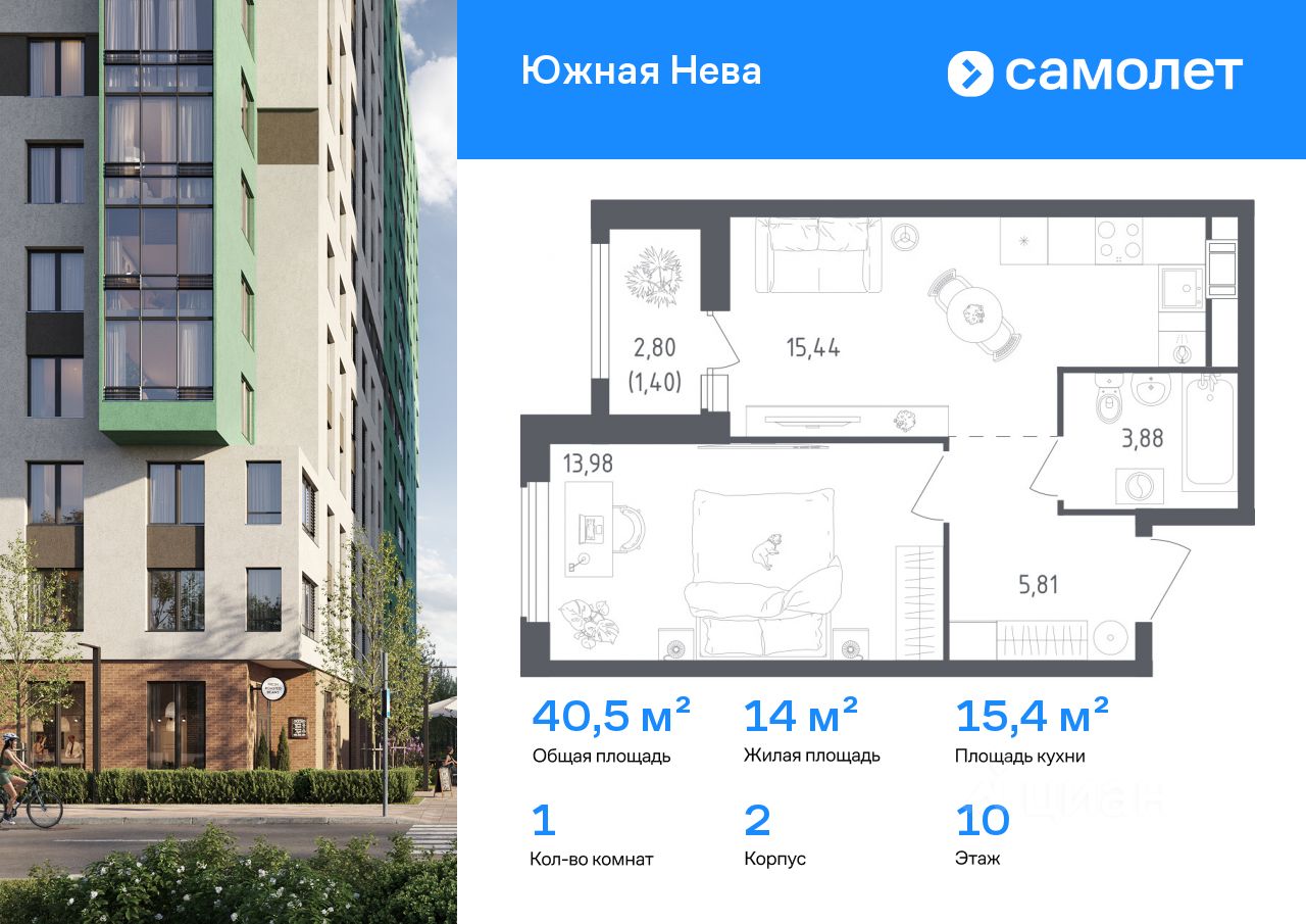 Строим кварталы для жизни с заботой о будущем. Предлагается 1-комнатная квартира комфорт-класса 40,51 кв.м в корпусе 2 на 10 этаже, в ЖК "Южная Нева"