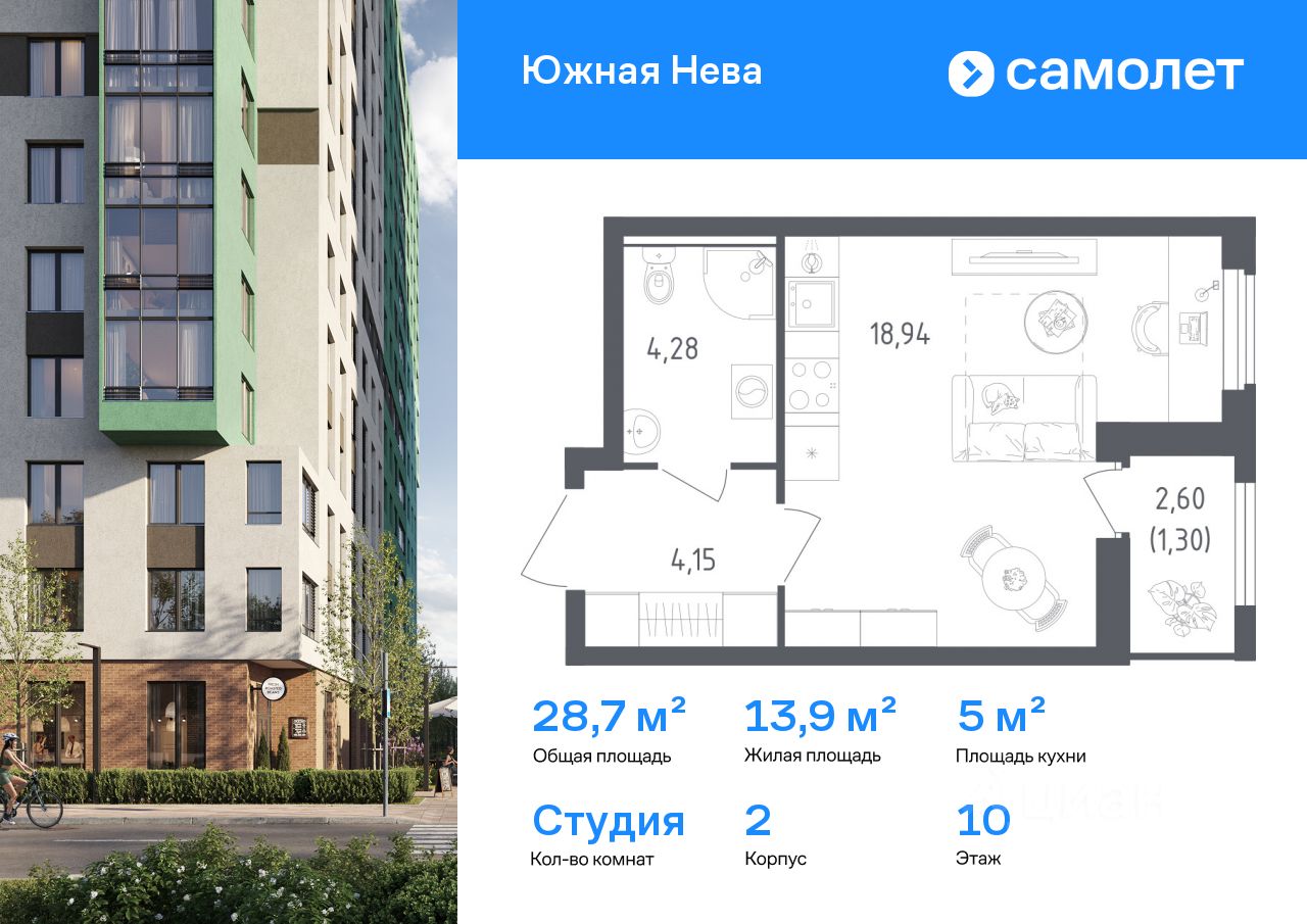 Строим кварталы для жизни с заботой о будущем. Предлагается квартира студия комфорт-класса 28,67 кв.м в корпусе 2 на 10 этаже, в ЖК "Южная Нева"