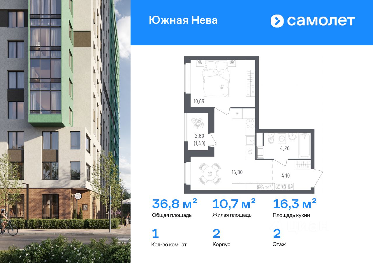 Строим кварталы для жизни с заботой о будущем. Предлагается 1-комнатная квартира комфорт-класса 36,75 кв.м в корпусе 2 на 2 этаже, в ЖК "Южная Нева"