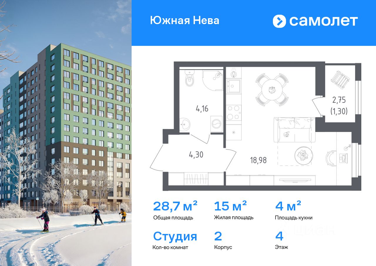 Строим кварталы для жизни с заботой о будущем. Предлагается квартира студия комфорт-класса 28,74 кв.м в корпусе 2 на 4 этаже, в ЖК "Южная Нева"