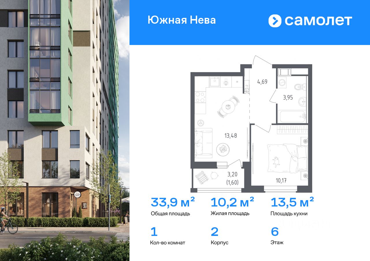 Строим кварталы для жизни с заботой о будущем. Предлагается 1-комнатная квартира комфорт-класса 33,89 кв.м в корпусе 2 на 6 этаже, в ЖК "Южная Нева"
