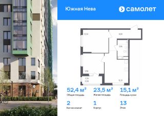 Строим кварталы для жизни с заботой о будущем. Предлагается 2-комнатная квартира комфорт-класса 52,37 кв.м в корпусе 1 на 13 этаже, в ЖК "Южная Нева"