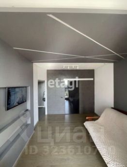 Гостиная оборудована кондиционером, широким деревянным подоконником, который служит удобной рабочей зоной, и современной ТВ-панелью с декоративной подсветкой.