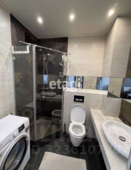 В санузле — душевая кабина и керамогранит, размещена стиральная машина.