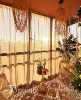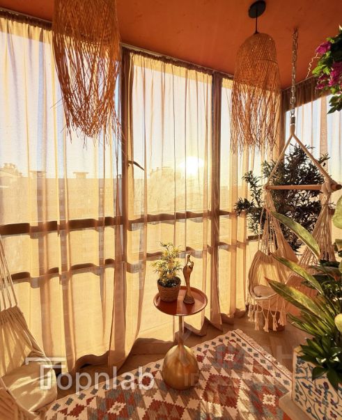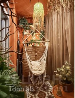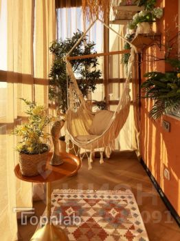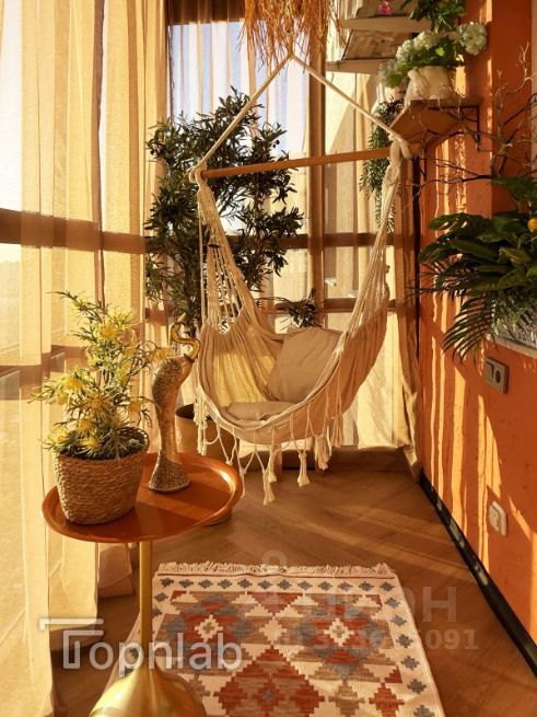 На просторном балконе 4,2 м² с теплым полом устроена комфортная зона отдыха с двумя гамаками и зоной хранения. Благодаря панорамному остеклению и окнам на северо-восток, в квартире много естественного света.