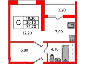 Квартира шикарной планировки (по факту полноценная однокомнатная квартира), которая имеет отдельную жилую зону 12,2 кв.м. с окном, отдельную кухонную зону 7 кв.м. со вторым окном и выходом на лоджию, огромный коридор 6,8 кв.м. с выделенным местом под гардеробную, просторный санузел 4,1 кв.м. с полноценной ванной, предусмотрено место для установки стиральной машины.