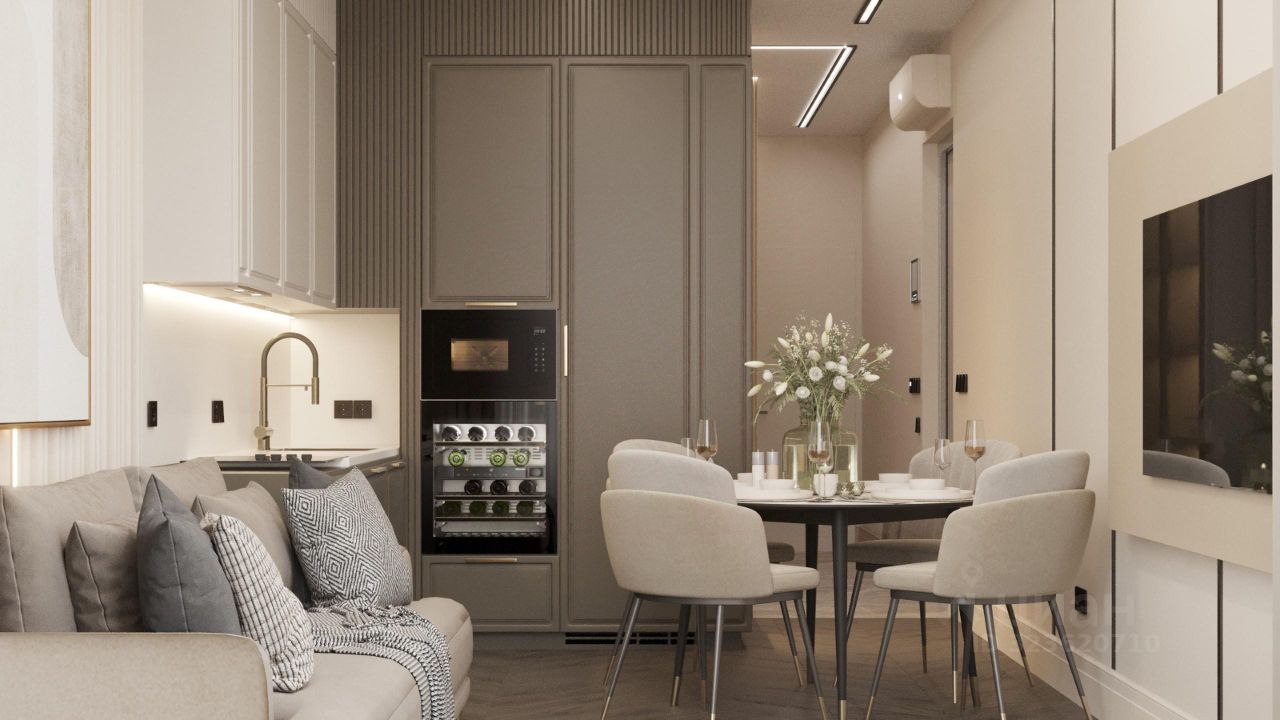 - просторная кухня-гостиная с ТВ-зоной, с шикарной оборудованной кухней