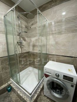 В ванной зеркало с подсветкой, шкаф под раковиной, душевая кабина, стиральная машина LG.