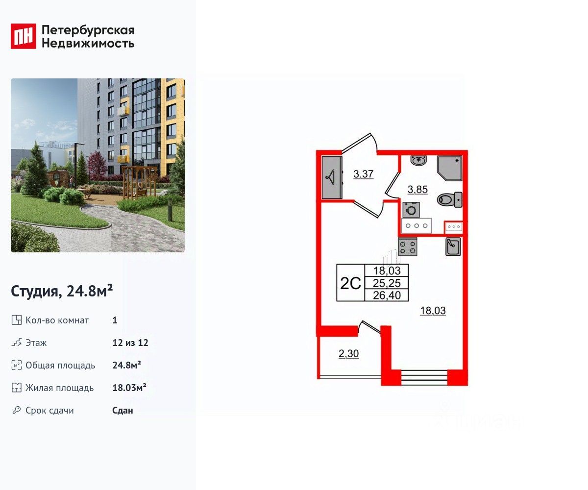 Удобная, классическая, функциональная европланировка, просторная прихожая 3.37 м². Общая площадь студии - 24.8 м², жилая 18.03 м², высота потолка 3.07 м.