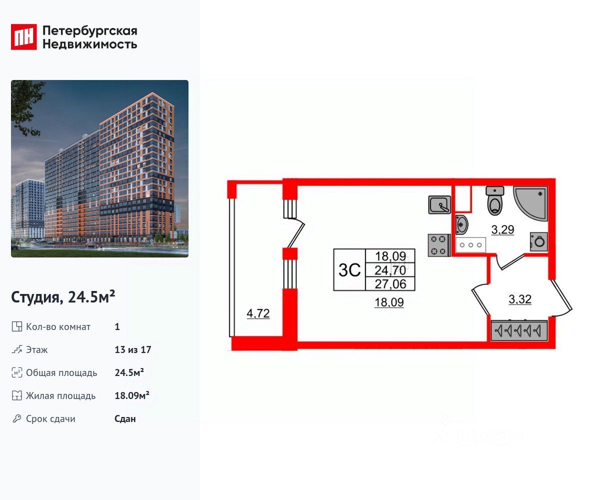 Удобная, классическая, функциональная европланировка, просторная прихожая 3.32 м². Общая площадь студии - 24.5 м², жилая 18.09 м², высота потолка 2.77 м.