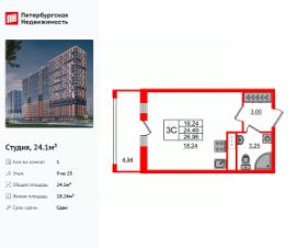 Удобная, классическая, функциональная европланировка, вместительная прихожая 3 м². Общая площадь студии - 24.1 м², жилая 18.24 м², высота потолка 2.77 м.