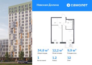 Строим кварталы для жизни с заботой о будущем. Предлагается 1-комнатная квартира комфорт-класса 34,8 кв.м в корпусе 1.2 на 12 этаже, в ЖК "Невская Долина"