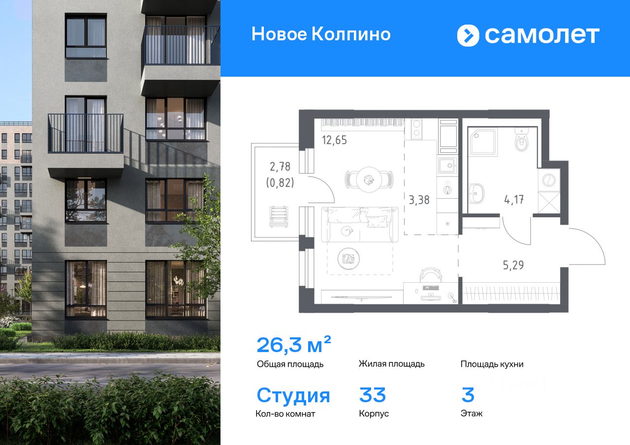 Строим кварталы для жизни с заботой о будущем. Предлагается квартира студия комфорт-класса 26,31 кв.м в корпусе 33 на 3 этаже, в ЖК "Новое Колпино"