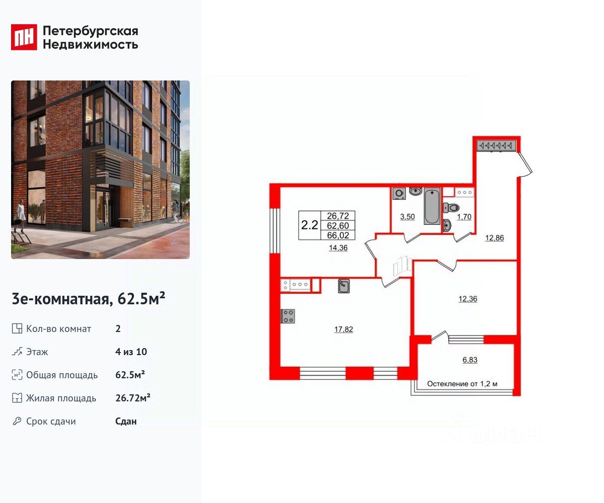 Удобная, классическая, функциональная европланировка, большая кухня-гостиная 17.82 м², просторная прихожая 12.86 м². Общая площадь квартиры - 62.5 м², жилая 26.72 м², высота потолка 2.77 м.