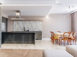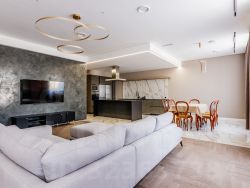 Квартира имеет уникальные видовые характеристики, выполненный по индивидуальному проекту дизайнерский ремонт и состоит из 3 спален, 1 кабинета, кухни-столовой совмещённой с гостиной, 3 смежных санузла, 2 гардеробные и 1 построчной.