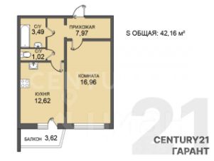 общая площадь — 42,16 м2;