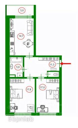 Комнаты 17 и 18 метров, тоже не маленькие. Санузлы разнесены в разные части квартиры. Большая прихожая сразу дает хороший объем и ощущение простора.